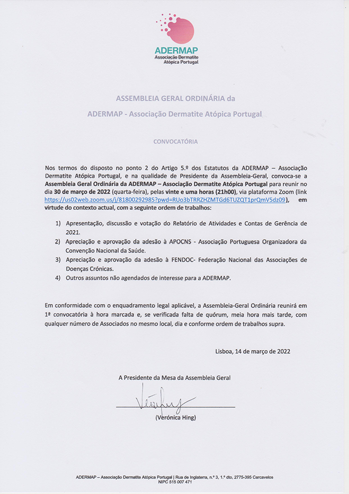 No próximo dia 30 de março de 2022, pelas 21h00, será reunida a Assembleia-Geral Ordinária da ADERMAP - Associação Dermatite Atópica Portugal, através da Plataforma Zoom.