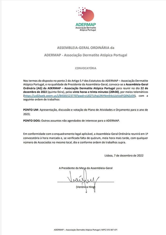 No próximo dia 22 de dezembro de 2022, pelas 20h30, será reunida a Assembleia-Geral Ordinária da ADERMAP - Associação Dermatite Atópica Portugal, através da Plataforma Zoom.