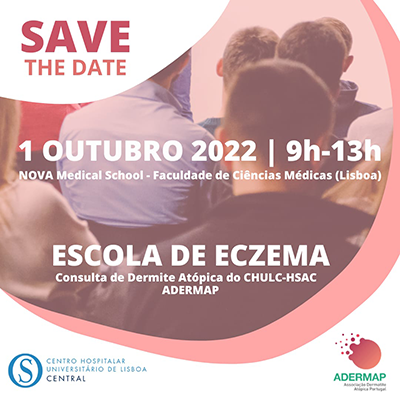 A ADERMAP e a Consulta de Dermite Atópica do Centro Hospitalar Universitário de Lisboa Central (CHULC-HSAC) uniram os seus esforços para organizar uma Escola de Eczema (presencial) na manhã do dia 1 de outubro (sábado), dirigida a informar e apoiar pessoas e famílias que vivem com Dermatite Atópica.