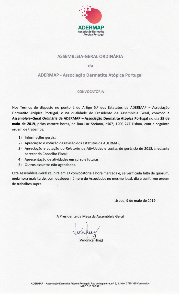 » Convocatória da 2ª Assembleia Geral Ordinária da ADERMAP Associação Dermatite Atópica Portugal